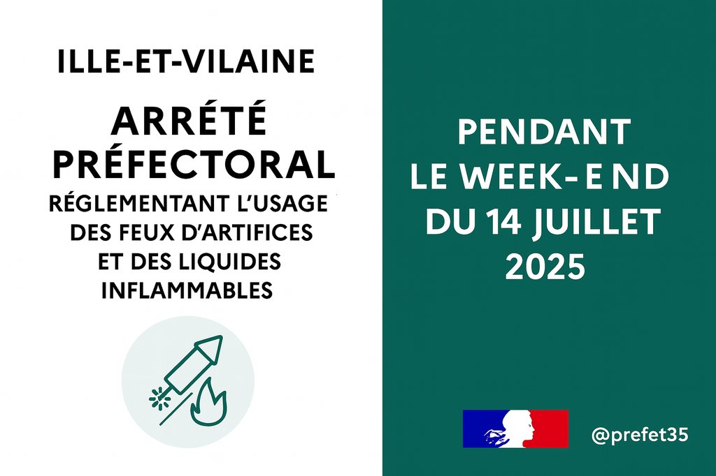 - Interdiction des artifices de divertissement et des articles pyrotechniques de toutes catégories à destination des particuliers en Ille-et-Vilaine, sur terrain privé et voie publique du 11 au 15 juillet