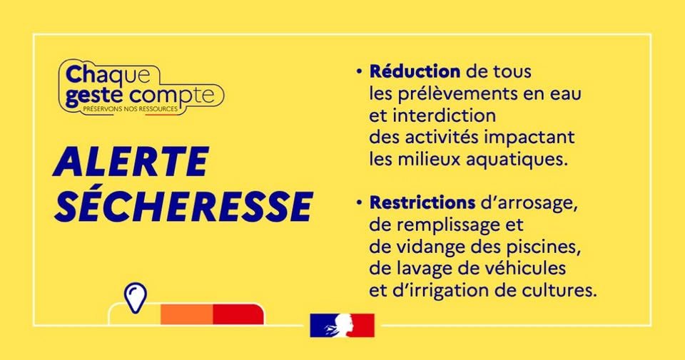 Au 11 juillet, l’ensemble du département de l’Ille-et-Vilaine est placé en état d’alerte sécheresse, quelle que soit la ressource en eau utilisée (eau potable, puits, prélèvement en cours d’eau, etc.). Cet état implique des restrictions, voire des interdictions, à certains usages de l’eau.