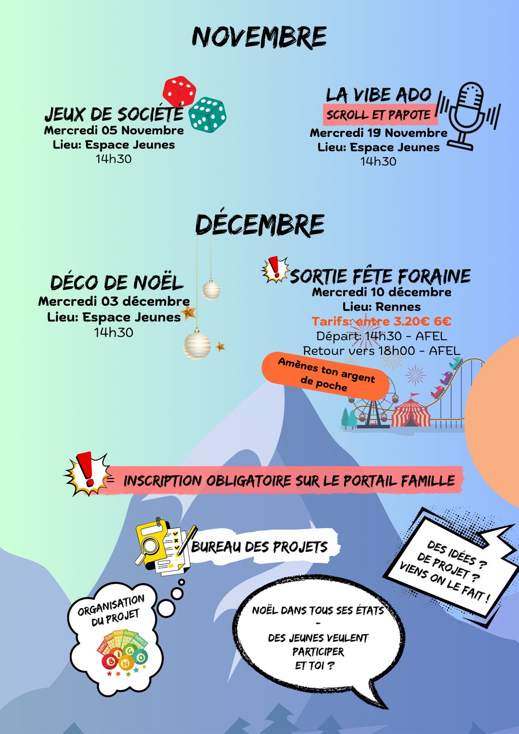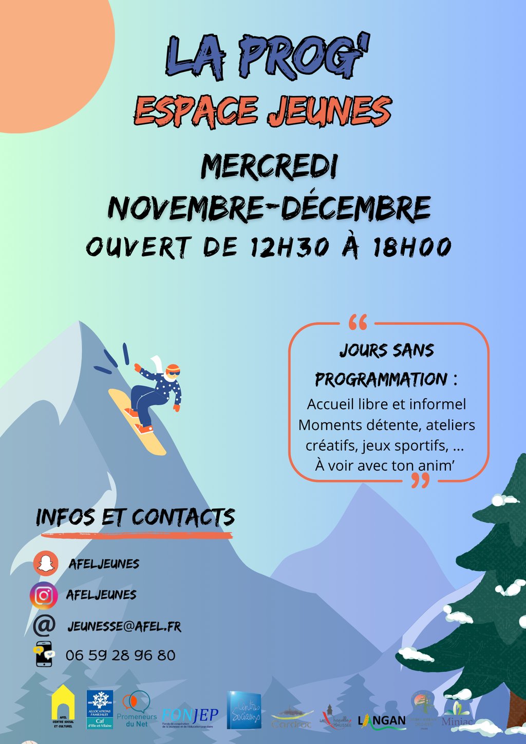 Programme de l'espace jeunes de l'AFEL pour les mois de novenmbre et décembre.
