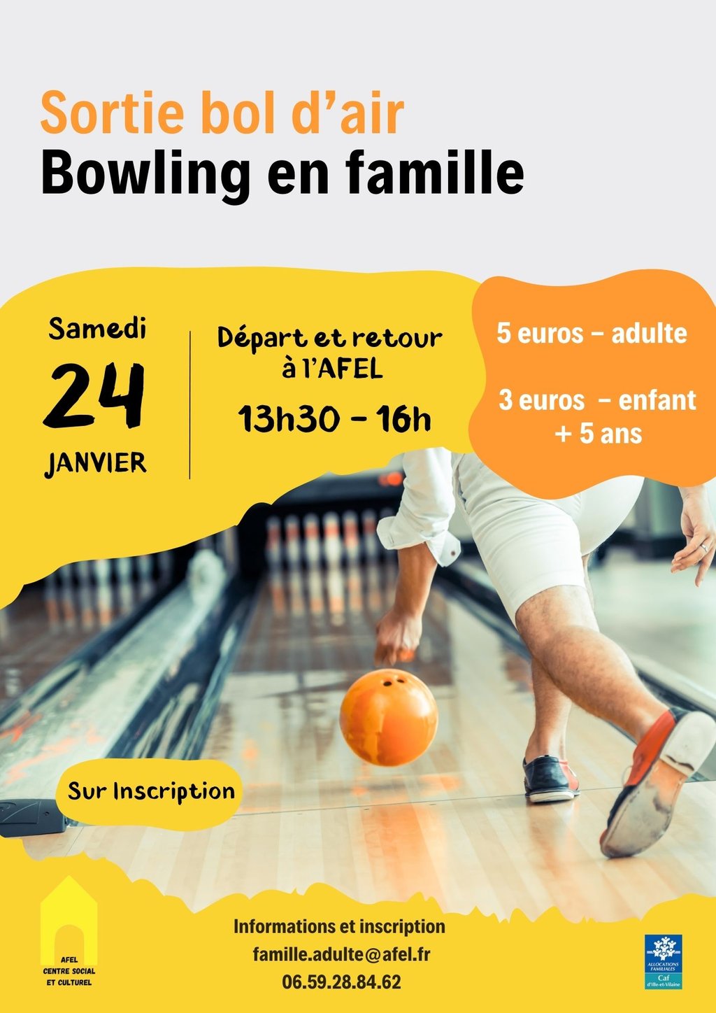 - Samedi 24 janvier : Sortie bol d'air Bowling en famille - Sur inscription - Départ et retour à l'AFEL 13h30-16h - 5€ (adulte) 3€ (enfant +5ans)