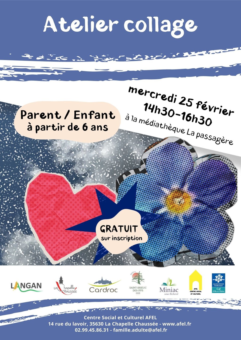 - Mercredi 25 février : Atelier collage - Parent/Enfant à partir de 6 ans - 14h30/16h30 - médiathèque La Passagère - Gratuit sur inscription