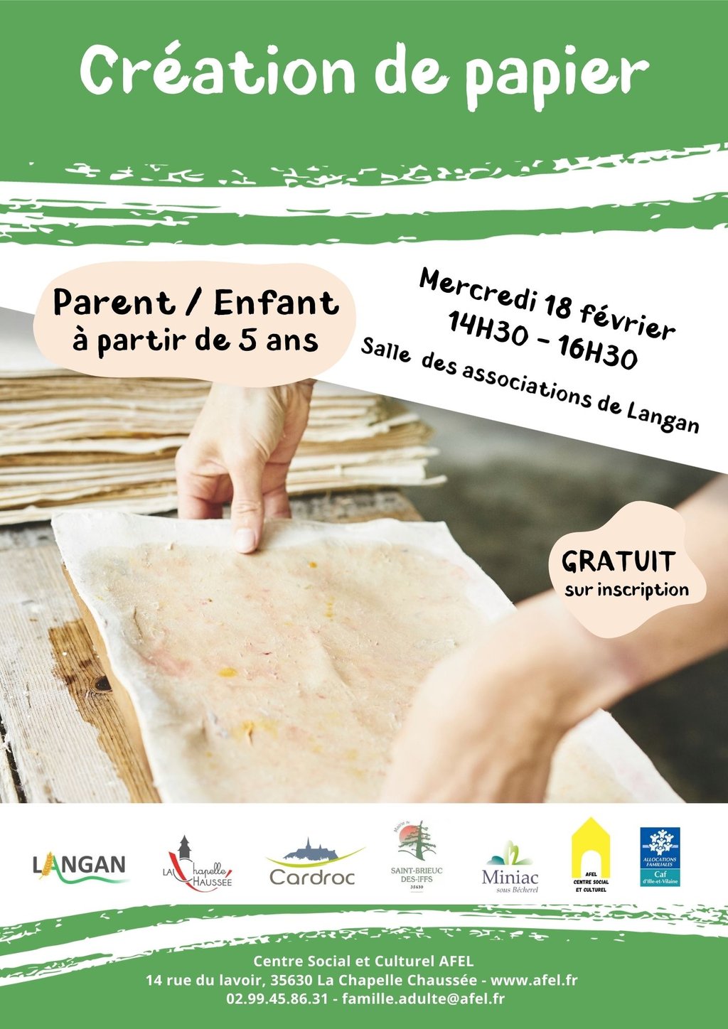 - Mercredi 18 février : Création de papier - Parent/Enfant à partir de 5 ans - 14h30/16h30 - Salle des associations de Langan - Gratuit sur inscription