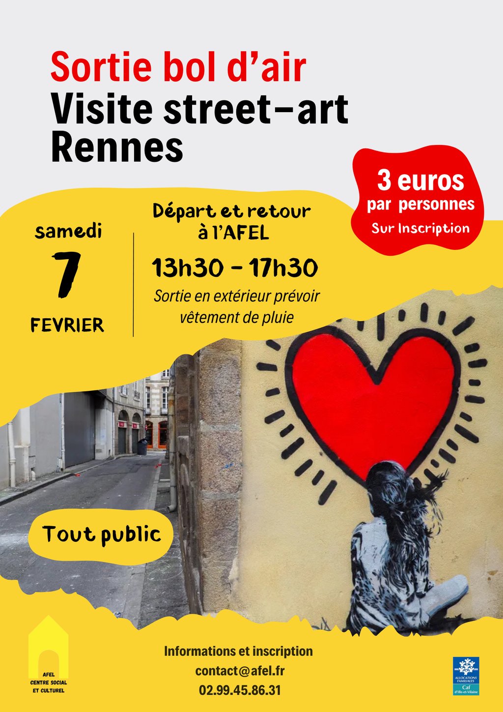 - Samedi 07 février : Sortie bol d'air Visite Street-Art à Rennes - Prévoir vêtement de pluie - 13h30/17h30 - Tout public - 3€/pers - Sur inscription