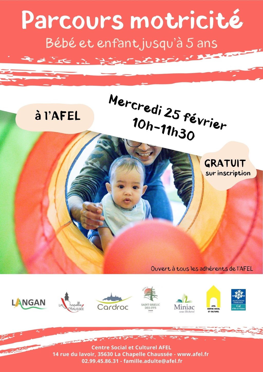 - Mercredi 25 février : Parcours motricité - Bébé et enfant jusqu'à 5 ans - 10h/11h30 - AFEL - Gratuit sur inscription