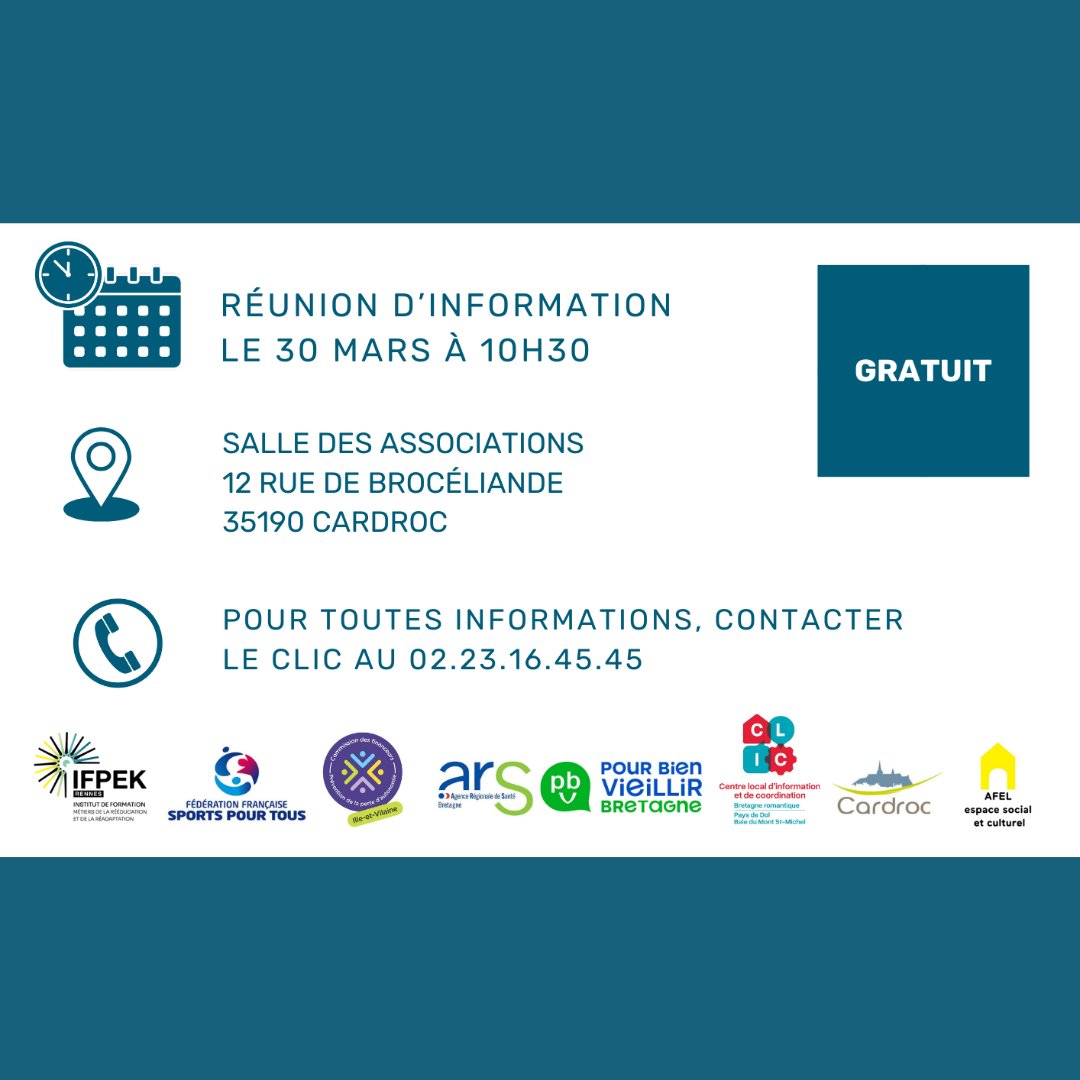 Après une séance d’information le lundi 30 mars à 10 h 30 , un cycle de 8 séances est programmé à la salle des associations (12 rue de Brocéliande) de Cardroc, les lundis 24 avril, 4-11-18 mai, 1-8-15 juin et 14 septembre 2026 de 10 h 30 à 12 h 30.